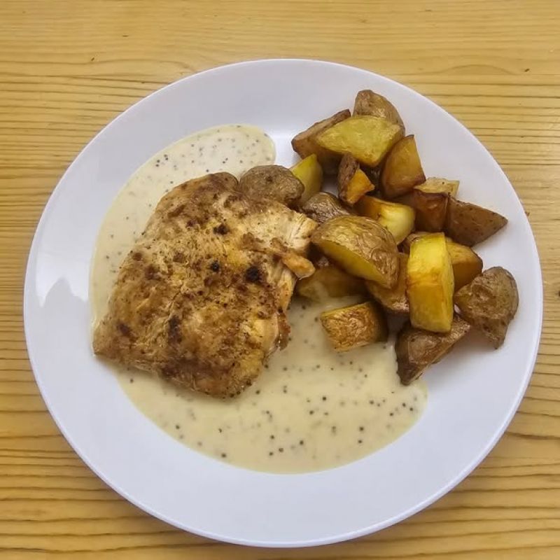 150g Vepřová kotletka s jemnou pepřovou omáčkou, americké brambory s česnekem