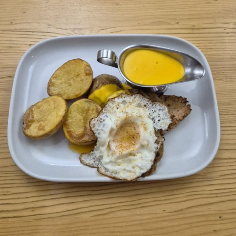 Grilovaný kuřecí steak, šunka, volské oko, hranolky, tatarka 137