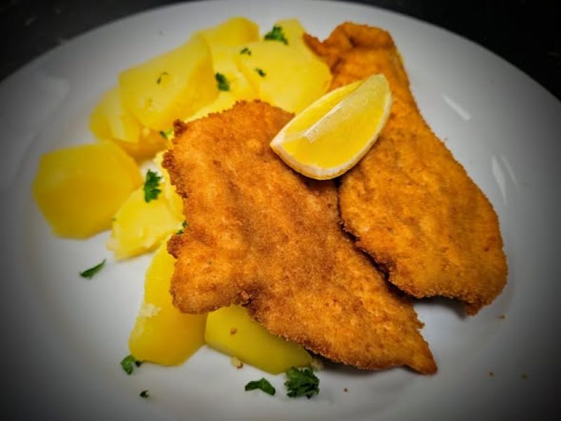 Vepřový řízek s kotlety na česneku brambory hranolky tatarka