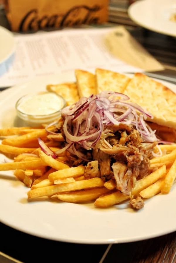 Zeleninový salát, kuřecí gyros, koprovo-česnekový dresink, focaccia s bylinkami a olivami