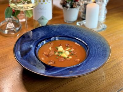 Hovězí guláš s houskovým knedlíkem, křenem, kozím rohem a cibulí (1, 3, 7)