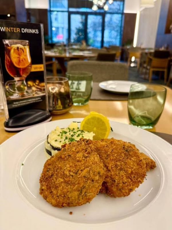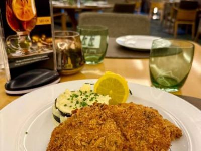 Cordon bleu, bramborová kaše, okurkový salát 137