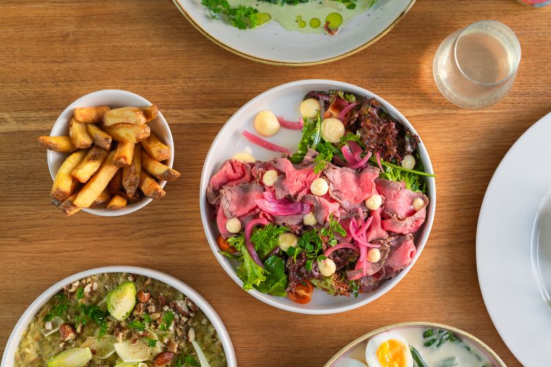 E). 350g Kousky čerstvého losose na grilu podávaného na zeleninovém salátu Mix, zálivka sladko - kyselá, opékaná bageta s rukolovým pestem