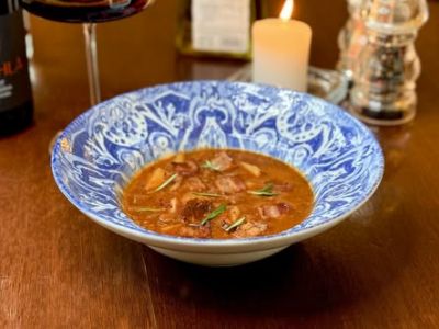 0,20 kg SEGEDINSKÝ GULÁŠ „SPECIÁL“ s kynutým houskovým knedlíkem a nočkem zakysané smetany 1,7
