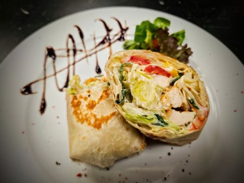 140g Quesadilla - grilovaná pšeničná tortilla plněná trhaným marinovaným vepřovým masem, cheddarem a goudou s BBQ, salátek, guacamole
