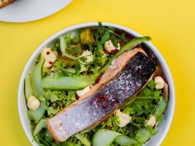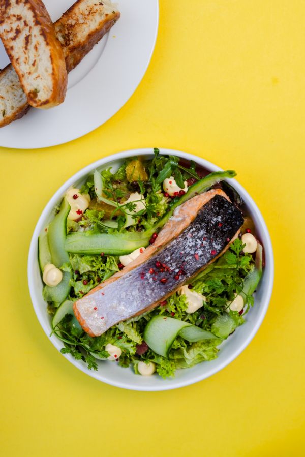 Grilovaný steak z lososa s pečenými grenaille, mladým hráškem, špenátem a holandskou omáčkou –