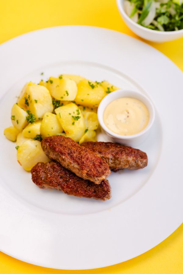 B) Grilovaný hovězí steak z mletého masa, volské oko, pečené domácí brambory, pikantní dip (1, 3, 7)