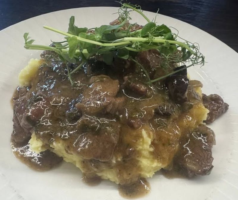 120g Hovězí pupek konfitovaný v husím sádle, šťouchaný brambor, vídeňská cibulka A1,12