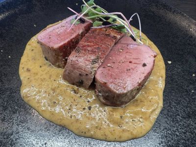 200g VEPŘOVÁ PANENKA NA GRILU pečená do růžova, batátové pyré, petrželový chips (1,3,7)