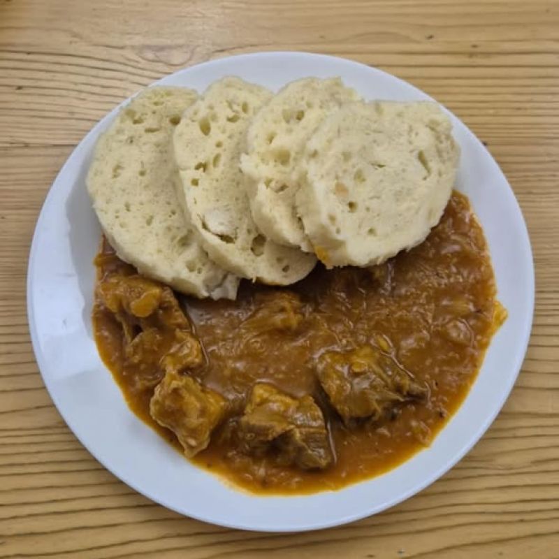 150g Vepřová kýta na paprice, houskový knedlík (1,3,7) …