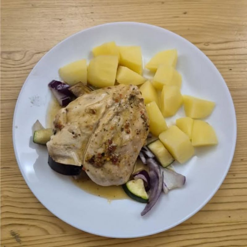 150g Kuřecí prso z grilu s batátovým pyré a ratatouille zeleninou s čerstvými bylinkami
