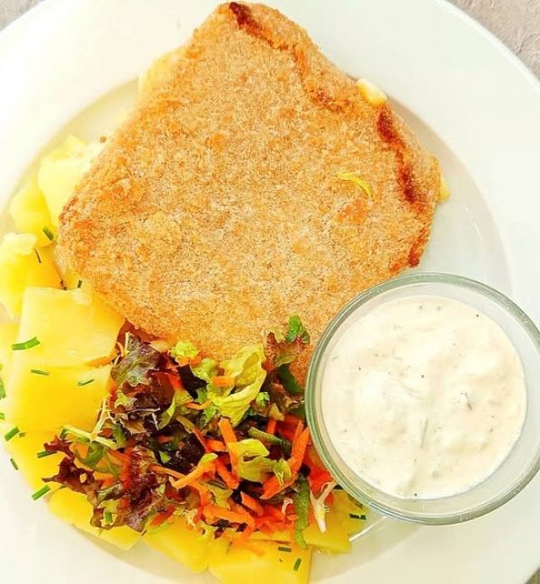 Telecí řízek smažený na sádle s vídeňským bramborovým salátem, cornichons 1310