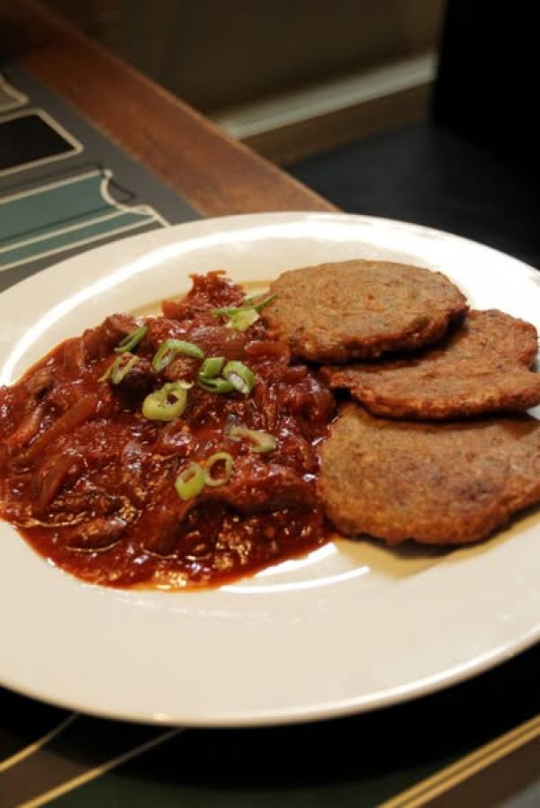 Hovězí guláš na plzeňském pivu s česnekovými bramboráčky –