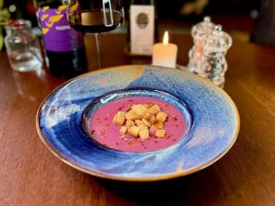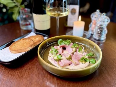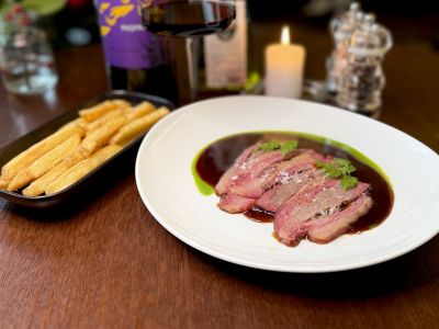 120g Hovězí pupek marinovaný v červeném víně, konfitovaný v husím sádle, šťouchaný brambor, karamelizovaná cibulka A1, 12