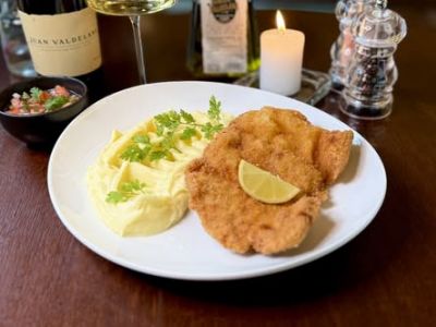 Víděňská roštěná, bramborové rösti, sázené vejce s opečenou slaninou 1, 3