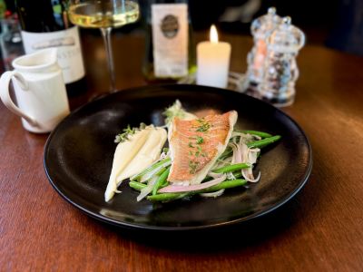 1ks Filátko ze pstruha, pečené grenaille, grilovaná zelenina, bylinkový dip A3,4,7,9