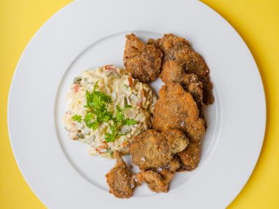 Smažený vepřový řízek v bylinkové strouhance, vídeňský bramborový salát