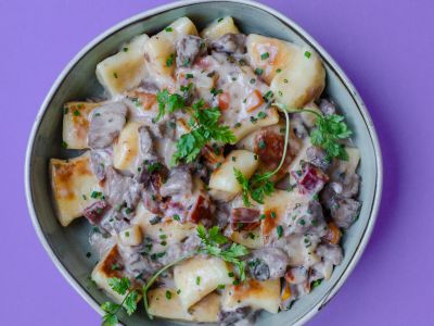 Bramborové noky s kuřecím masem, smetanou a listovým špenátem