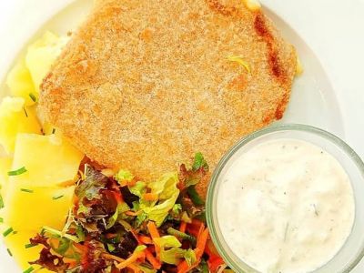 Krůtí řízek s bramborovým salátem s jablky, jogurtem a citronem –