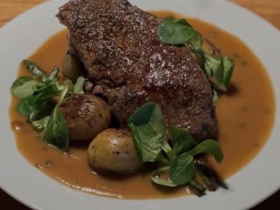 Vyzrálý hovězí Rump steak, batátové hranolky, pepřová omáčka