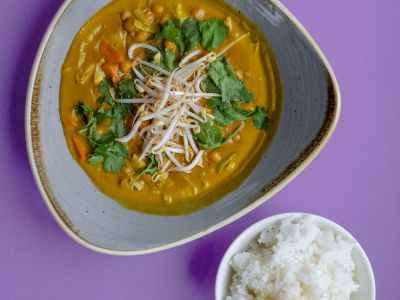 Thajská kuřecí prsa na červeném kari s kokosovým mlékem a ananasem, podávaná s jasmínovou rýží