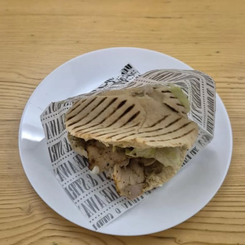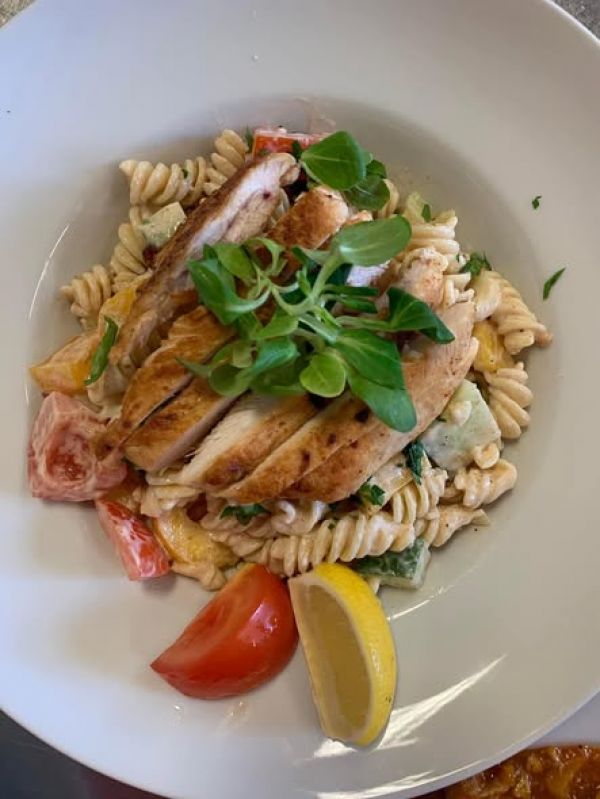 MENU VI: CHICKEN & HERMELÍN SALAD - 100g grilovaná kuřecí prsa, ½ grilovaný sýr hermelín, salát, rajče, okurek, smažená cibulka, česnekový dip, opečené pečivo