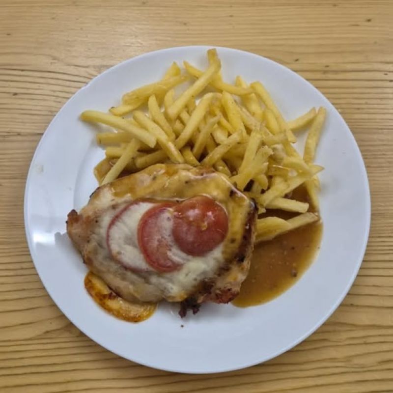 Smažená vepřová kapsa plněná šunkou a hermelínem, hranolky, tatarka (1, 3, 7)