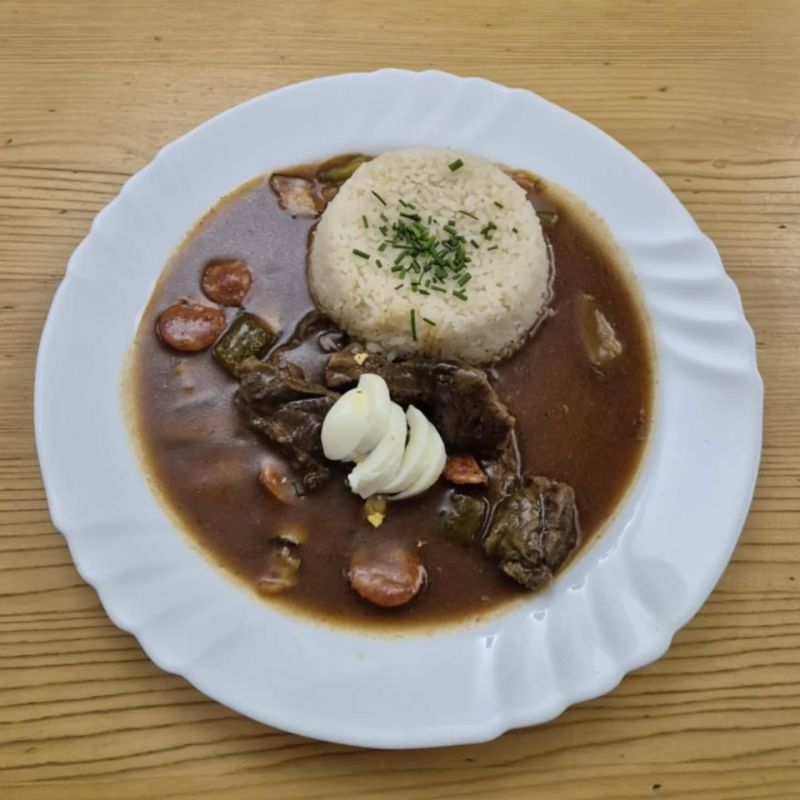120g Vepřové kostky na černém pivu a slanině s rýží nebo houskovým knedlíkem 137
