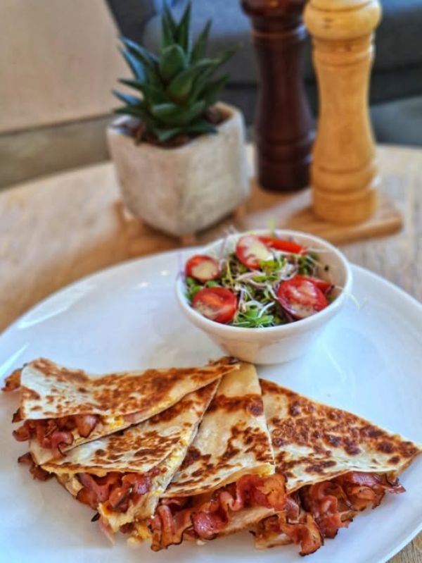 Quesadilla s kuřecím masem, špenátem a mozzarellou, česnekový dip, hranolky