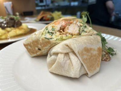 Wrap s trhaným lososem, listovým salátem, tzatziki a hranolky julienne –