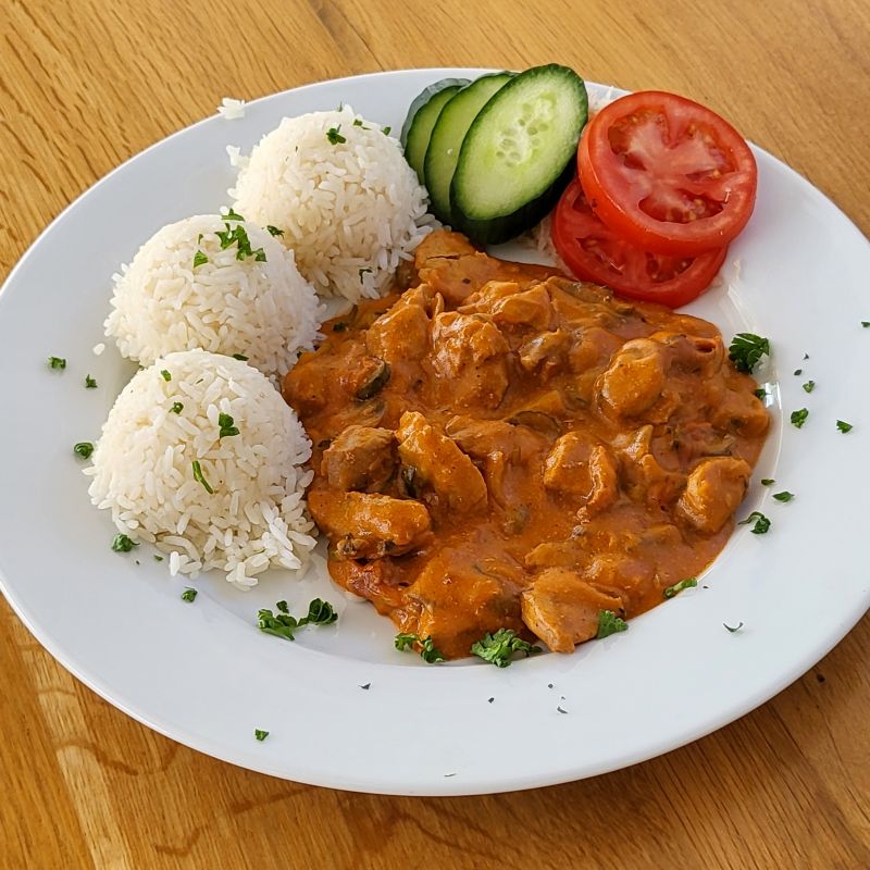 Restované kuřecí kousky v máslovo-rajčatové omáčce, zjemněná máslem.