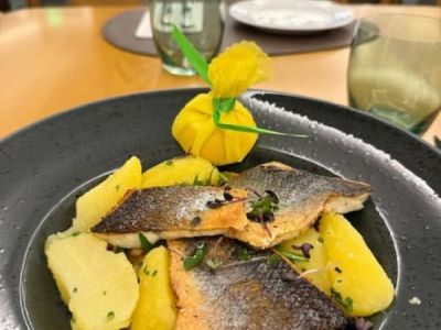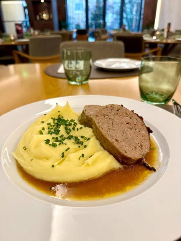 120g Hovězí pupek marinovaný v červeném víně, konfitovaný v husím sádle, šťouchaný brambor, karamelizovaná cibulka A1, 12