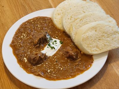 150g Vídeňský gulášek podávaný s domácím špekovým knedlíkem