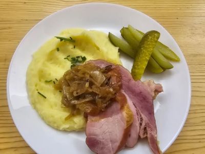 180g Pečený vepřový krk na pivu a kořenové zelenině, šťouchané brambory (1,7,9,12) …