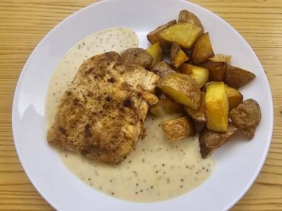150g Vepřová kotletka s jemnou pepřovou omáčkou, americké brambory s česnekem