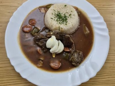 Segedínský guláš, domácí houskový knedlíkA: 1379