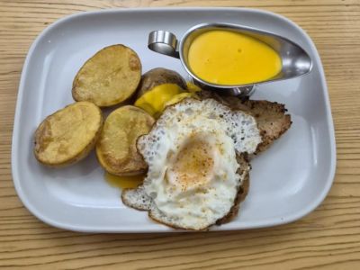 150g PANENKA PROSCIUTTO plněná šunkou Prosciutto a sýrem Mozzarella s chedarovou omáčkou podávaná s bramborem nebo hranolkami nebo s opikošema nebo s rýží