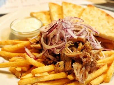 Šáwerma – Kuřecí tortilla plněná marinovaným grilovaným kuřecím masem, tahini, čerstvá zelenina posypaná zátarem A1, 11