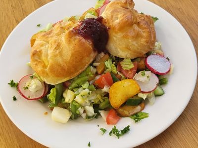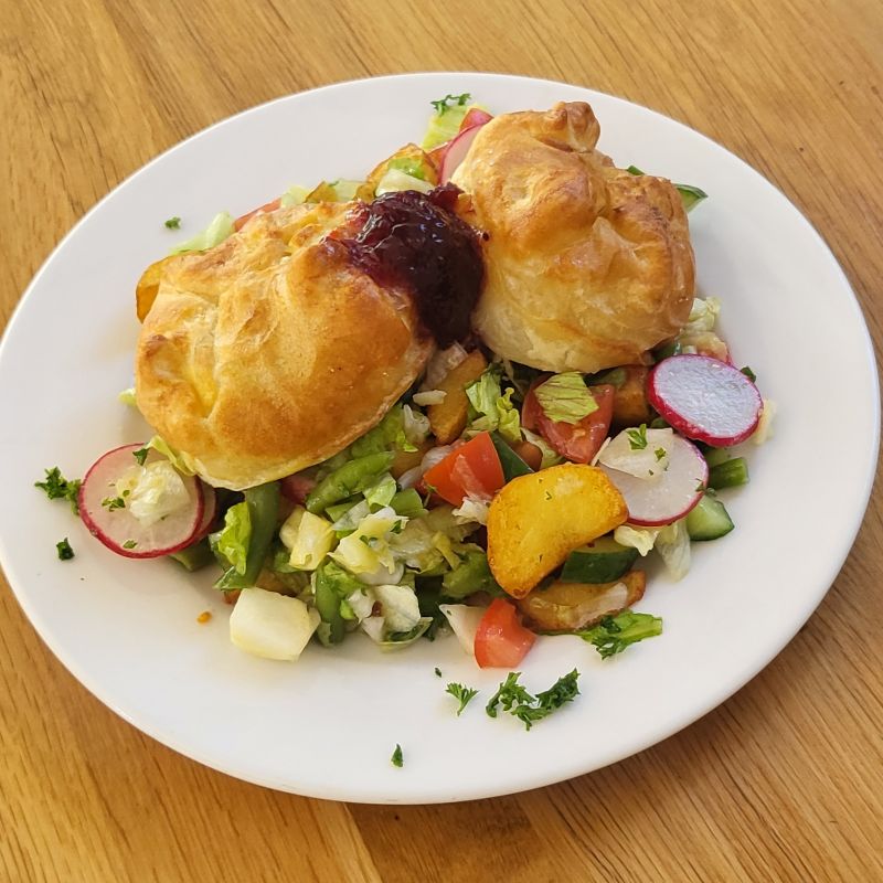 250g Grilovaný hermelín na mixu listových salátů a zeleniny, bylinkový toast