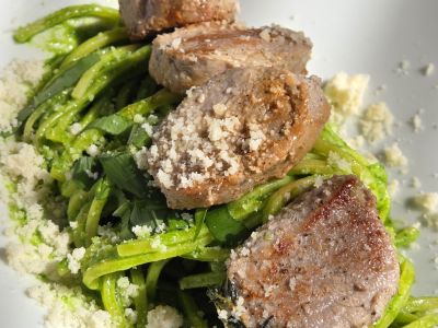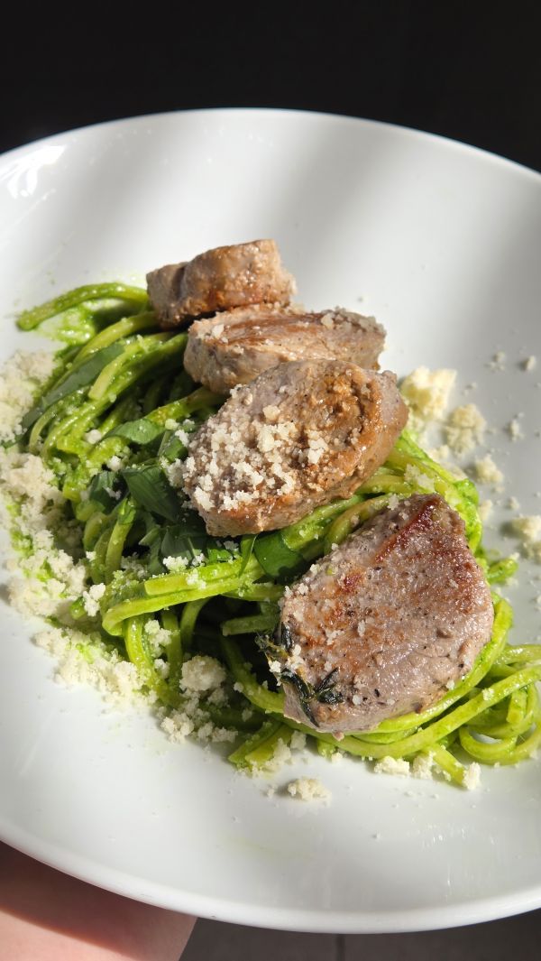 Špagety s pestem ze sušených rajčat, olivy, kapary, bazalka, parmazán