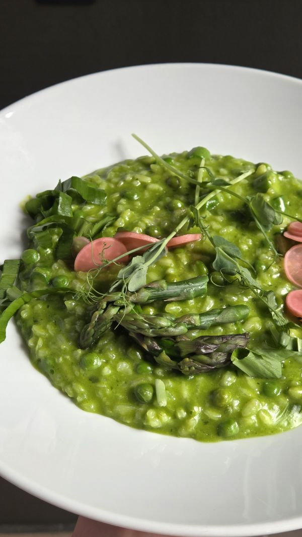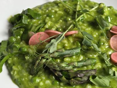 T2) Krémové rizoto s chřestem, kukuřicí, krůtím masem a rukolou 137