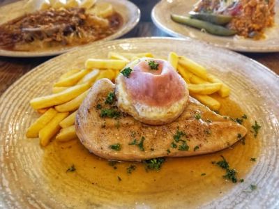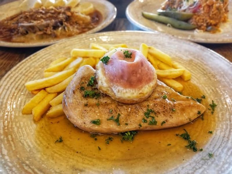 Kuřecí steak se šunkou a vejcem, hranolky, naše tatarka