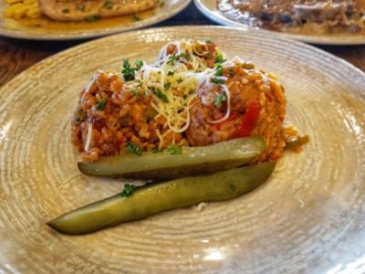 Rizoto z vepřového masa po srbsku, okurka, sýr gouda