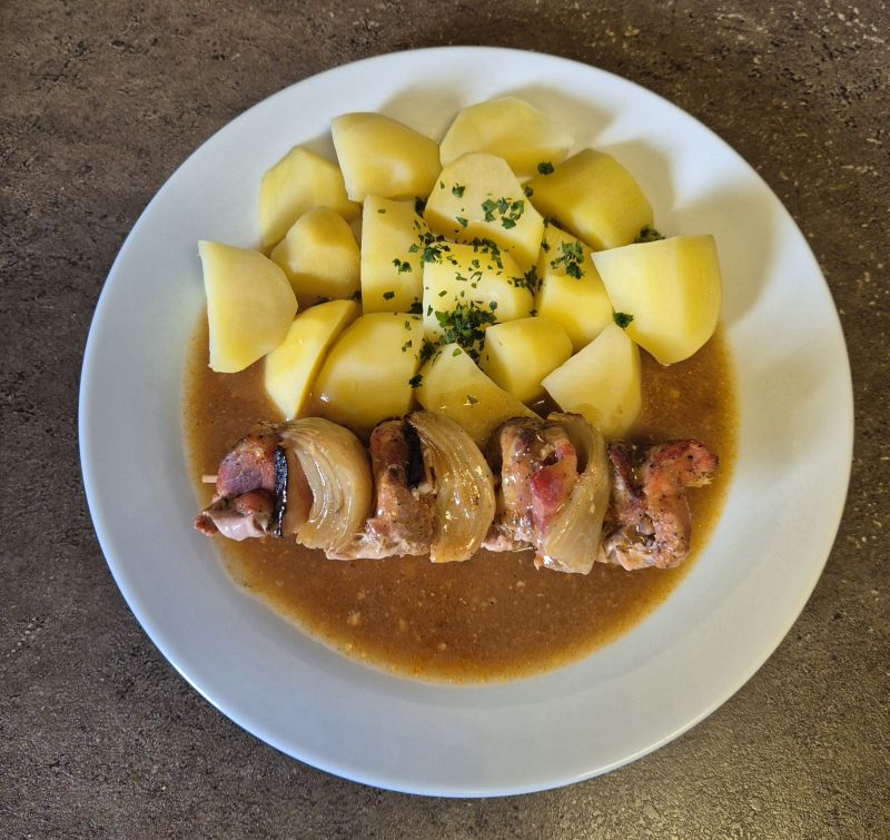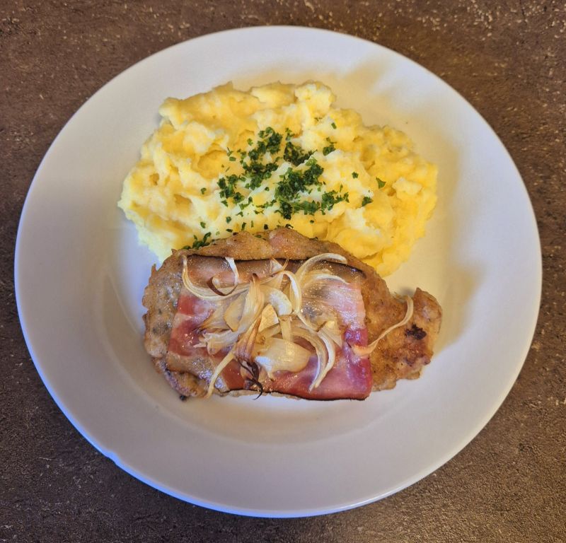 KUŘECÍ PRSA s cibulí a anglickou slaninou, šťouchaný brambor