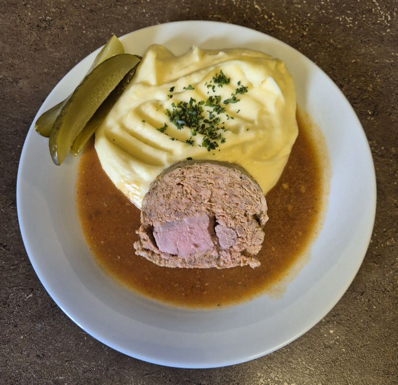 Vánoční vepřová roláda plněná mletým masem a švestkami, bramborová kaše