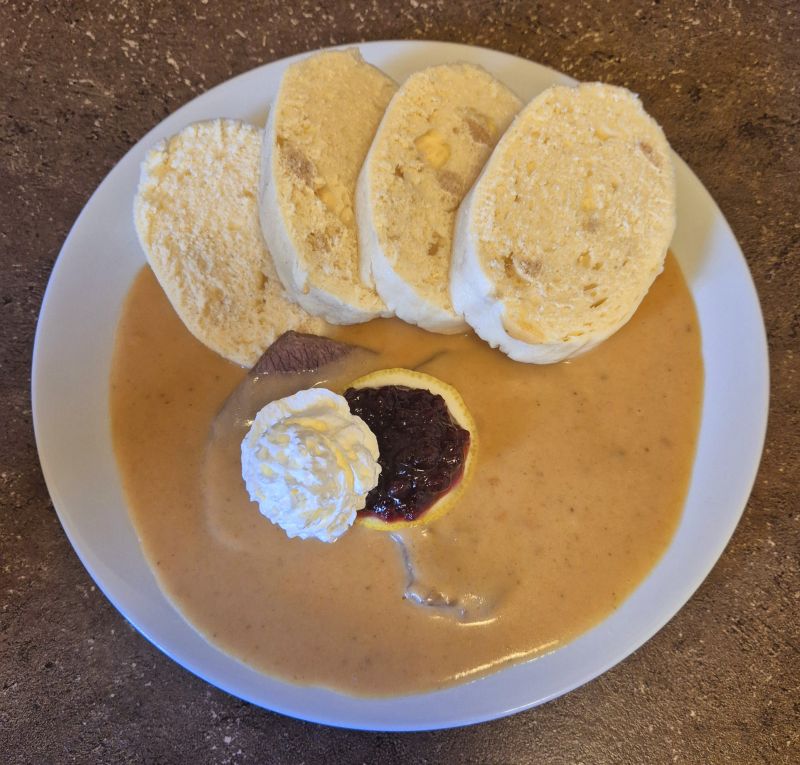150g Hovězí kostky na pepři, těstoviny nebo houskové knedlíky