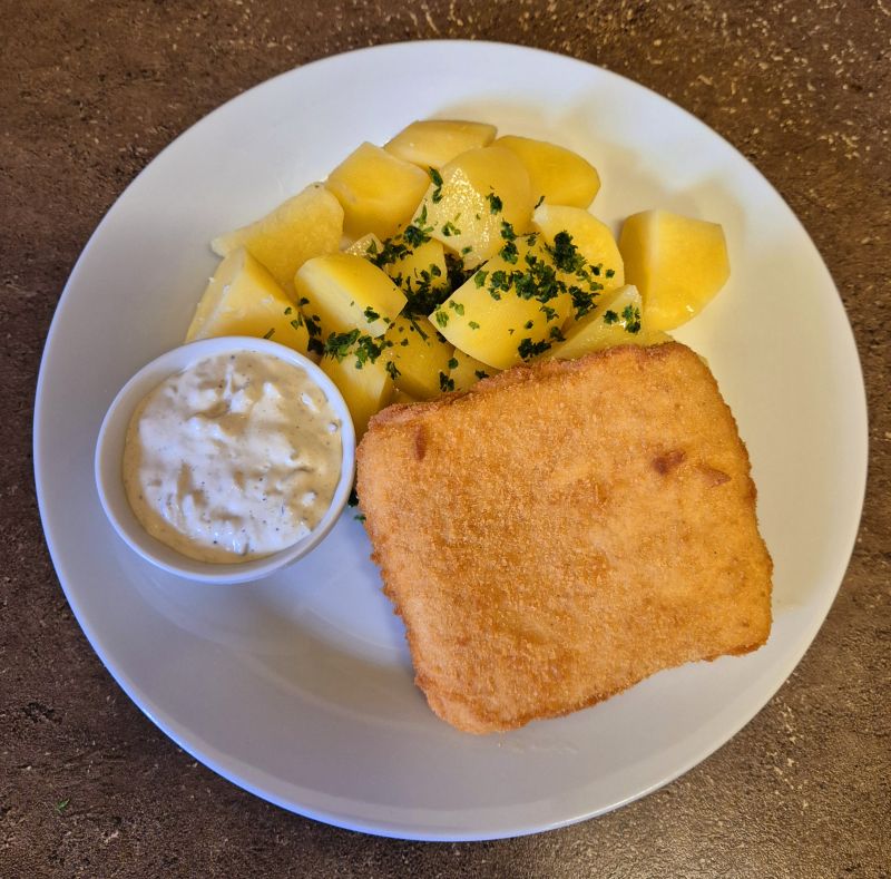 Smažený květák, vařené brambory s máslem a petrželkou, tatarská omáčka, salátek A1, 3, 7