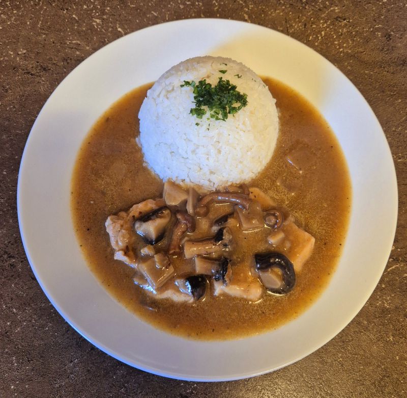 180g Vepřové kotletky na grilu, hříbková smetanová omáčka, smažené bramboráčky A1, 3, 7