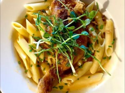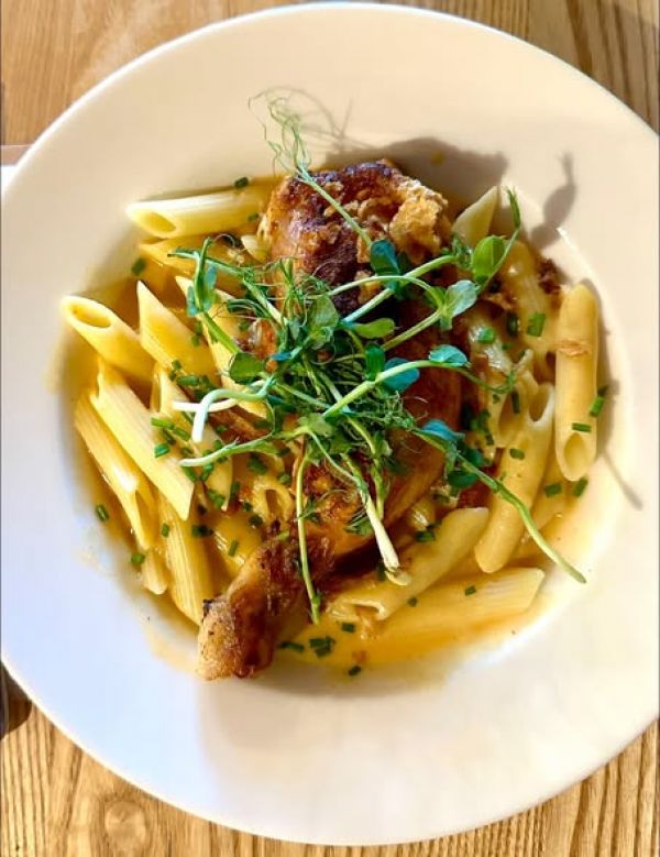 Spätzle se špenátem, filírované kuřecí prso, hobliny parmazánu