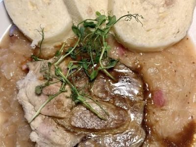 Trhané hovězí s koprovou omáčkou, domácí houskový knedlík